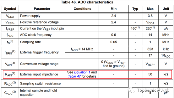 以STM32F103為例子,在數(shù)據(jù)手冊中可以看到外部輸入阻抗有一個(gè)最大值50kΩ的要求。