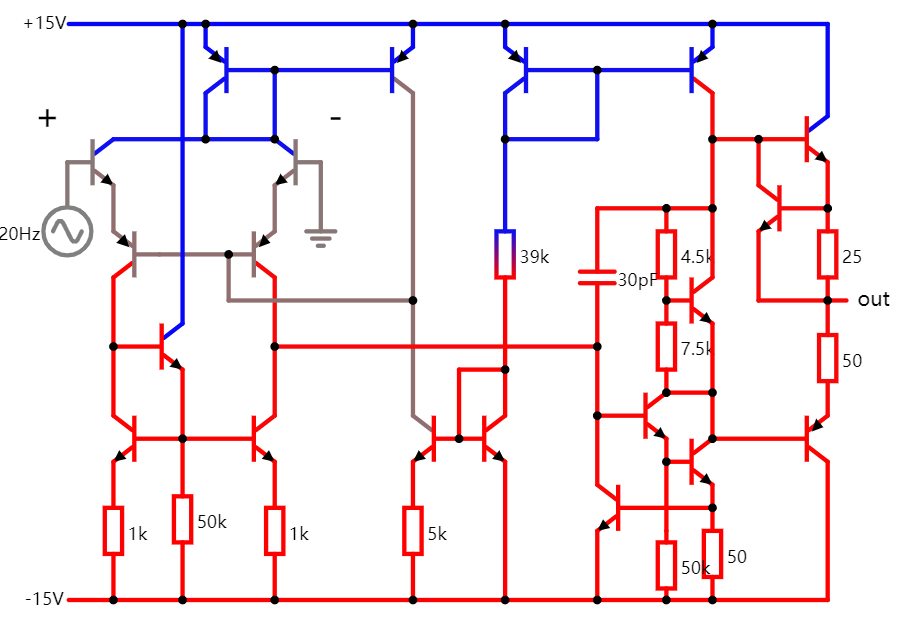 最后,再貼一個經(jīng)典運放的內(nèi)部框圖741運放: