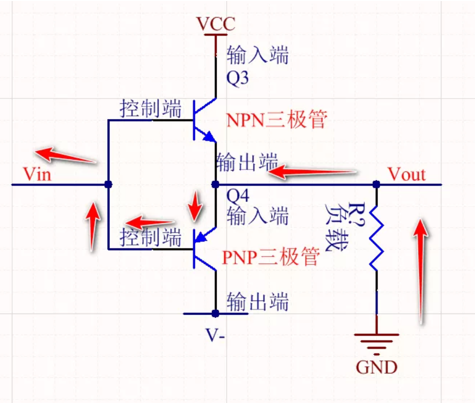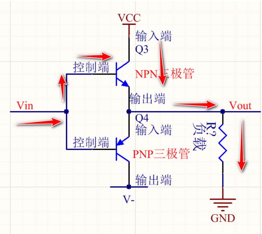當(dāng)Vin電壓為V-時(shí),下面的三極管有電流流出,Q4導(dǎo)通,電流方向如下圖。