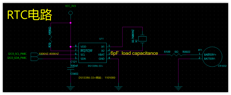 如上圖所示,此芯片為DS1339U-33+,3.3V供電,pin1和pin2腳接32.768KHZ的晶體,pin8腳接3.3V電源,pin3腳電池供電,這顆芯片的電源供電和電池供電不需要二極管,內(nèi)部有切換電路,當(dāng)3.3V電源斷電后自動(dòng)無縫切換到電池供電,控制方式I2C如上圖pin6和pin5腳,此接口并接在I2C總線上,芯片地址:1101000,查閱芯片資料有介紹芯片的地址,所用晶體規(guī)格有明確說明32.768KHZ的晶體需要6pf負(fù)載電容,常規(guī)的32.768KHZ晶體都是12.5pF。