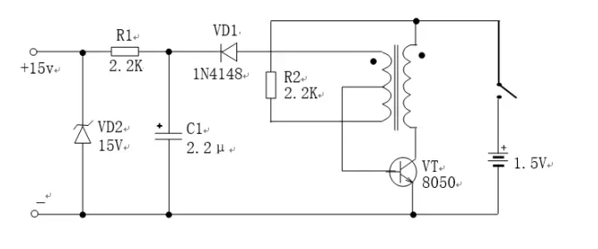 如圖所示是一種構(gòu)造很簡(jiǎn)單的小型直流升壓器,可用來(lái)取代15V的疊層電池。電路的核心元件一變壓器T使用的是袖珍驗(yàn)鈔器的專用變壓器。電路耗電約40mA,輸出電壓為15V。如果萬(wàn)用表15V電池的正極與1.5V電池的負(fù)極相接,只需將圖7—70中VD1(C1、VDZ的極性調(diào)過(guò)來(lái),這樣將輸出一個(gè)-15V電壓)