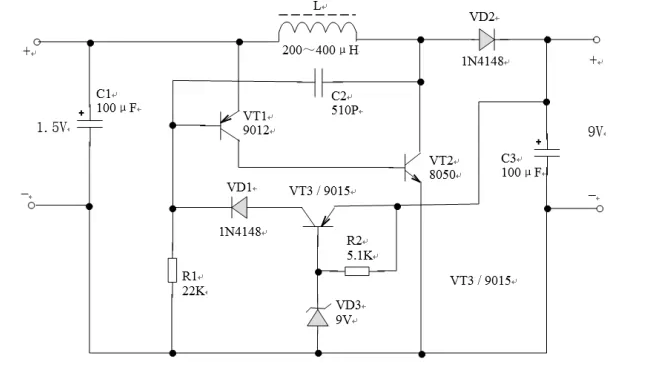 如圖所示是一種穩(wěn)壓型直流升壓電路。該電路可將一節(jié)1.5V的電池升壓至9V,用來(lái)取代9V疊層電池使用。電路空載輸人電流低于1.2mA,轉(zhuǎn)換效率高達(dá)60%。該電路由振蕩電路和穩(wěn)壓電路構(gòu)成,其中VT1、VT2、C2組成振蕩器,色碼電感L為儲(chǔ)能電感,VD2為整流二極管,C3為輸出濾波電容,VT3、VD1、VD3及R2為穩(wěn)定輸出電壓的穩(wěn)壓電路。輸出電壓約等于VD3的穩(wěn)壓值。