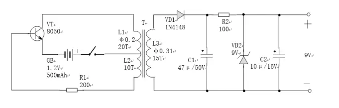 如圖所示是一種利用1.2V、500mAh的鎳鎘電池做電源的逆變電源電路,輸出直流電壓為9V,可供數(shù)字式萬(wàn)用表使用。下圖中變壓器T利用15mm的磁環(huán)穿繞而成(元器件參數(shù)圖中均已標(biāo)注人名為數(shù)字萬(wàn)用表的電源開(kāi)關(guān)。